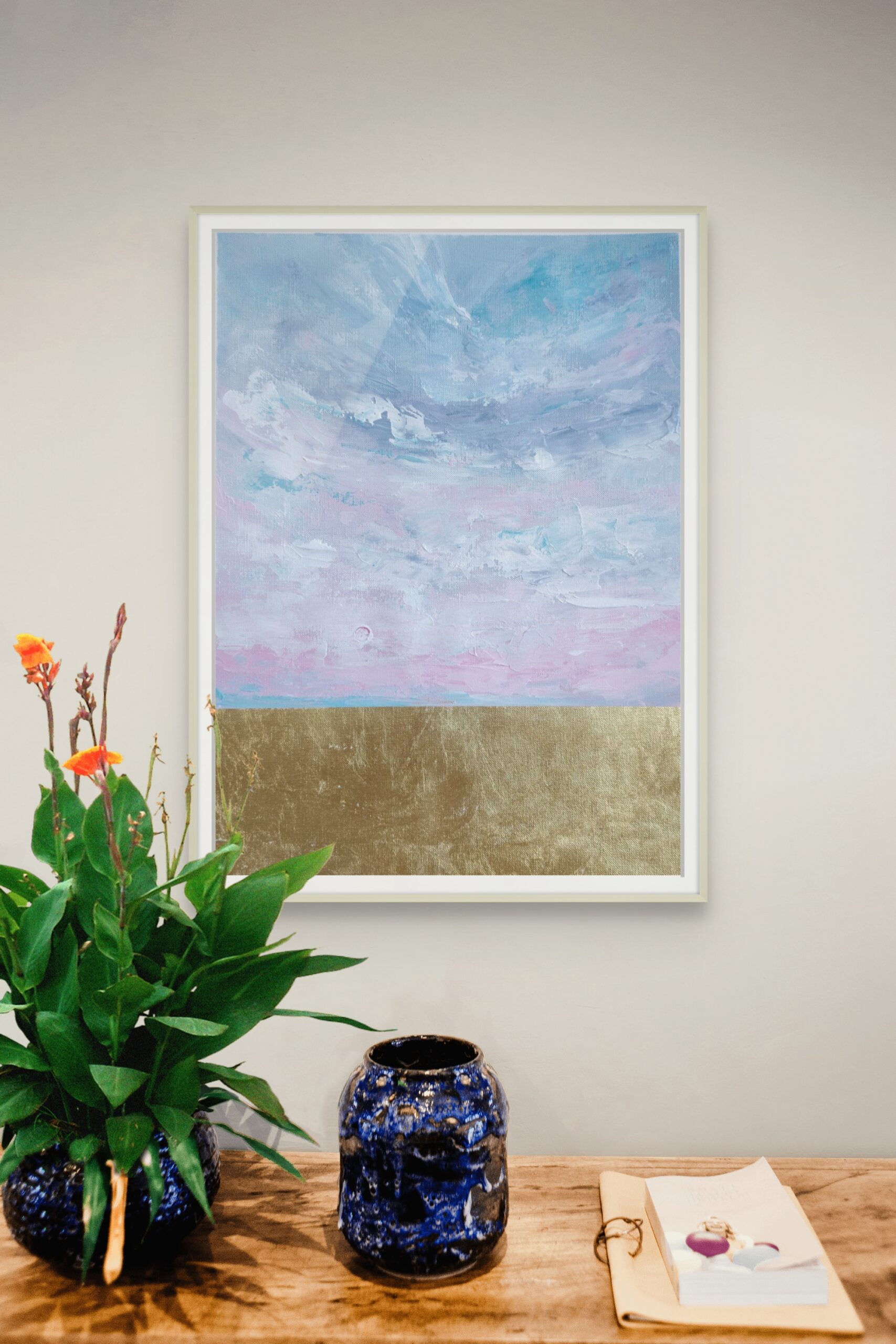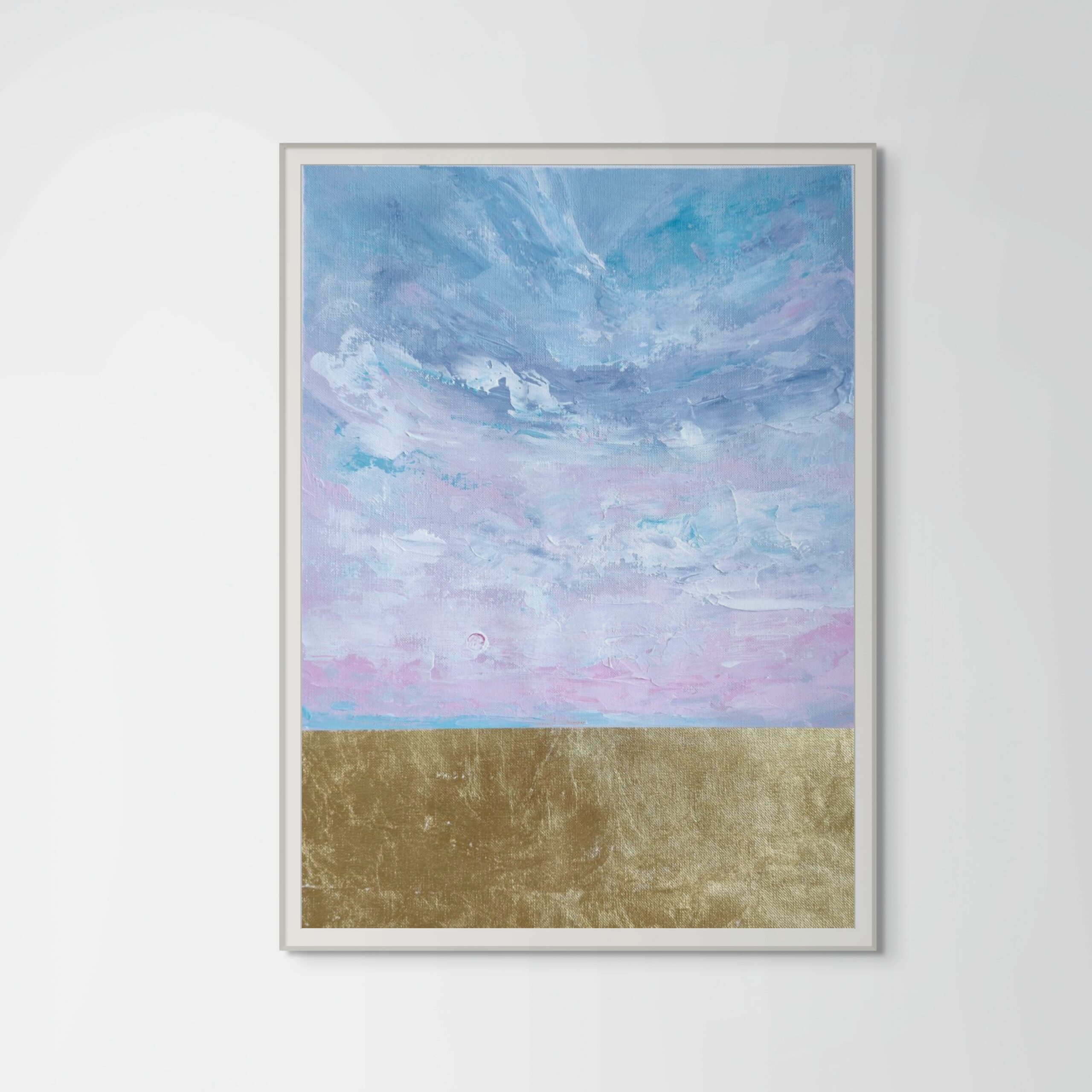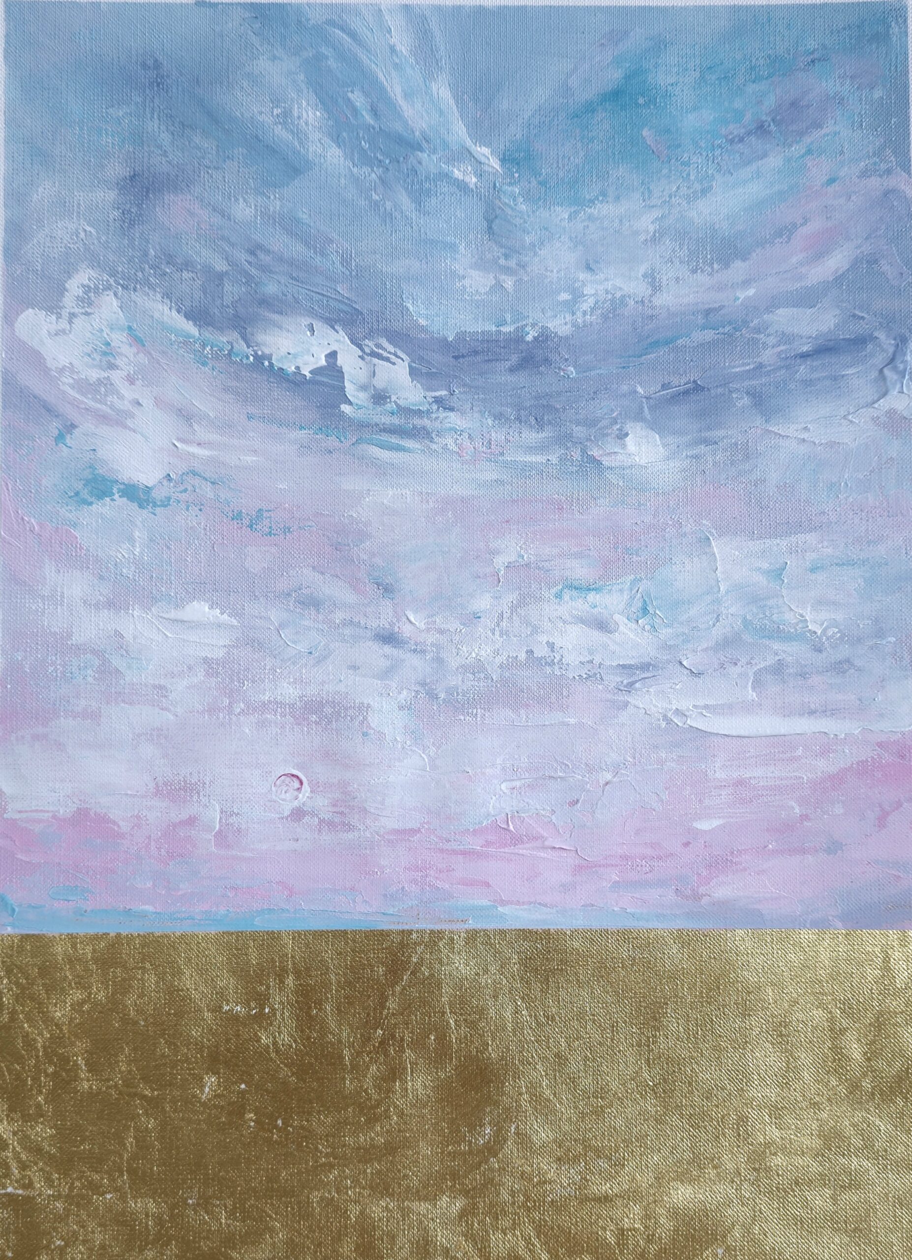Opis: Obraz w odcieniach różu, błękitu i turkusu. Wykonany na papierze bezkwasowym o strukturze płótna.